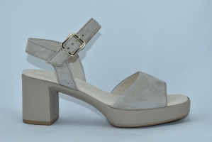 Sandaletter på klack i mocka. Klacken mäter 40mm och den översta remmen justeras med kardborreknäppning.